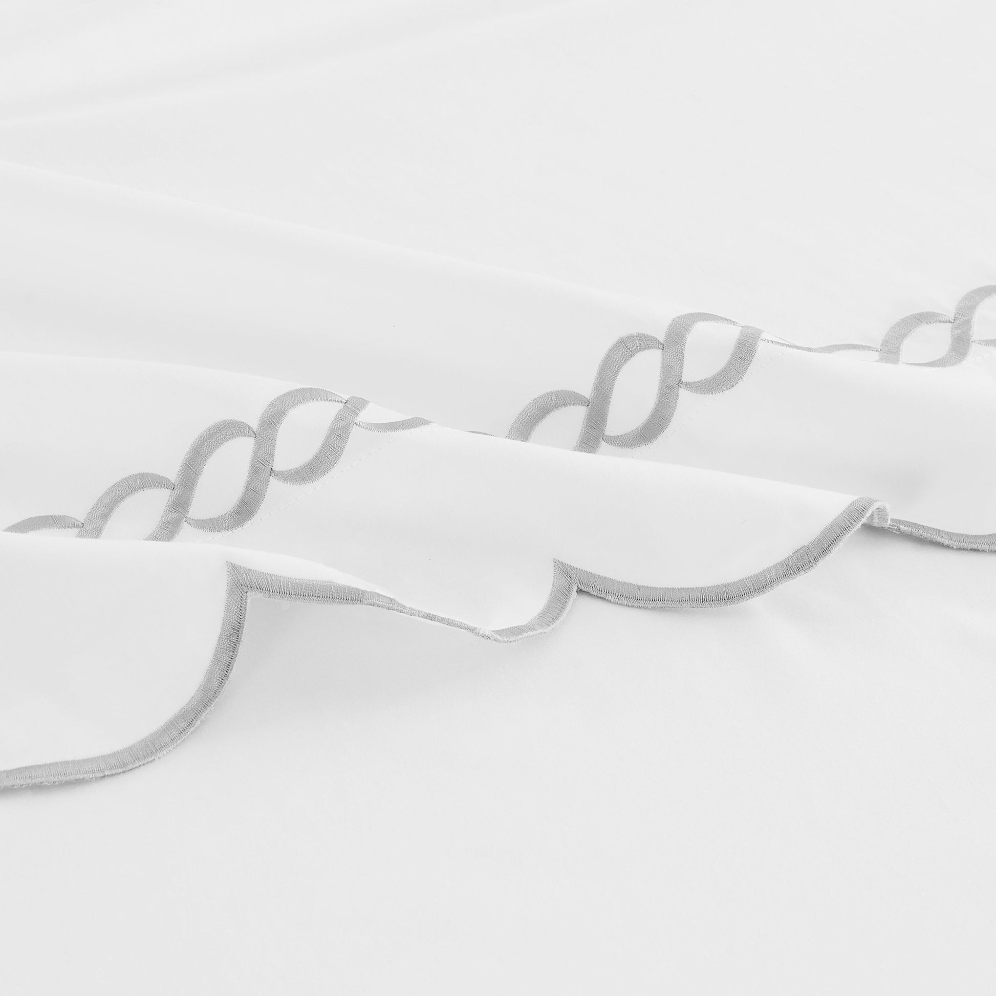 Our 600 thread count sateen sheet set is woven with extremely fine yet durable long staple cotton, producing an exceptionally smooth and soft sheet. We added an embroidered scalloped edge to our classic rope embroidery for extra style, and generously cut the fitted sheets to fit mattresses up to 18" deep. Exceptional quality and elegance, all at a comfortable price.
