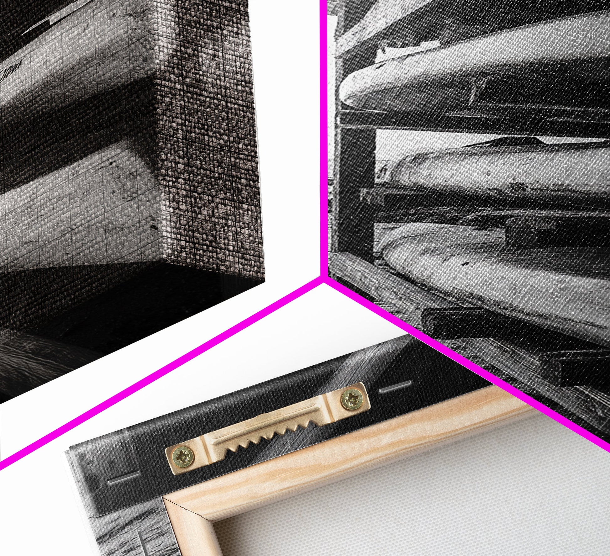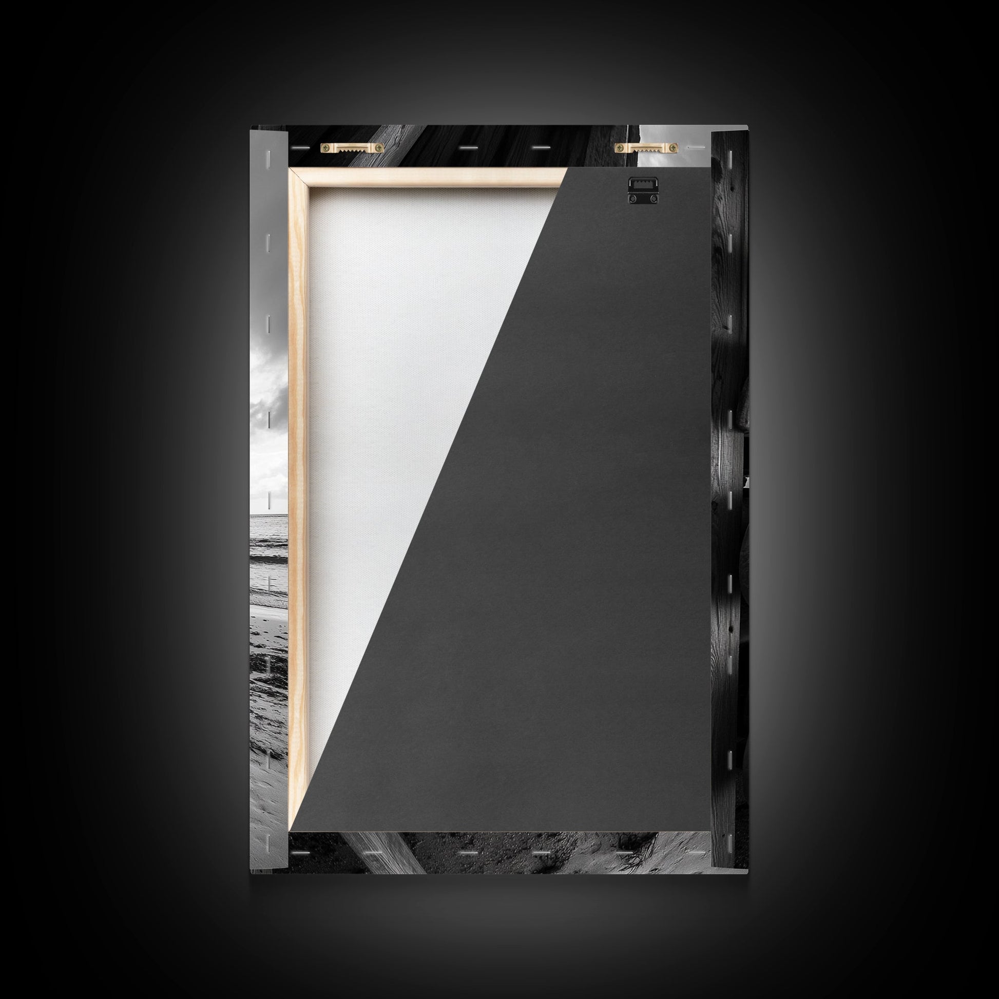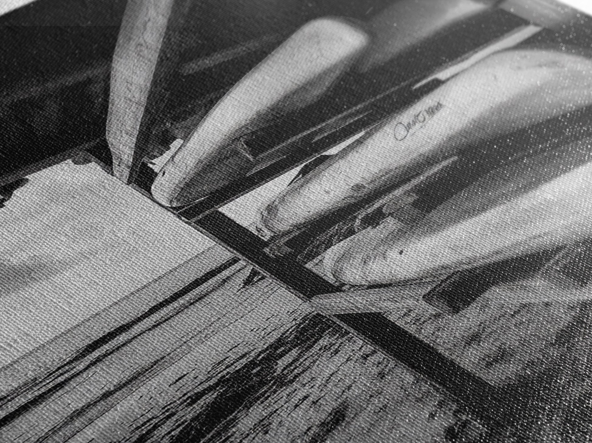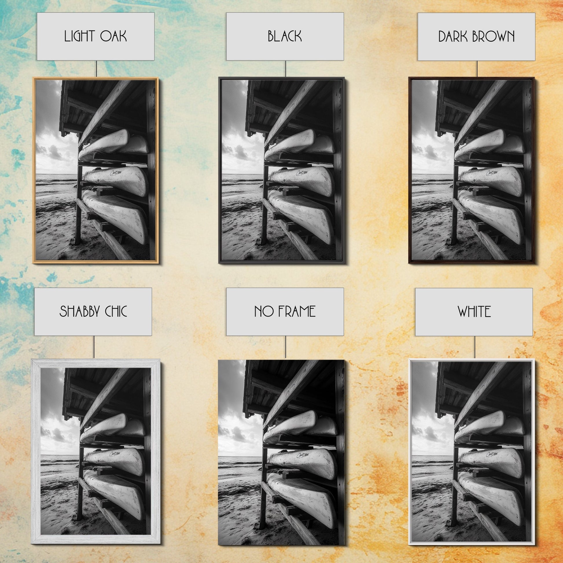Canoes, Rack, Ocean, Shelter - Surf shack vibes with coastal canoe stack, Framed Canvas Print, great beach house or boho hallway art, grayscale