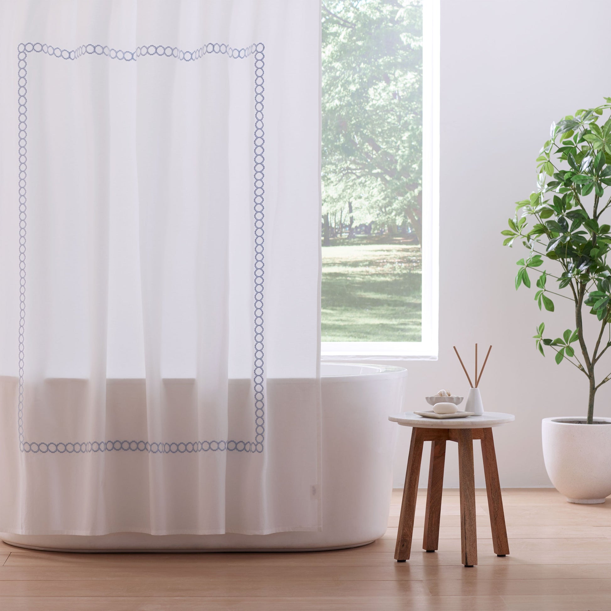 Elevate your bath with the subtle texture and clean lines of a waffle weave. Our Savoy Shower Curtain drapes beautifully with a raised geometric embroidery and classic buttonholes for hooks, transforming your shower into an elegant focal point. It's a simple swap with a classic look and feel to create your personal spa. Inspired by five-star hotels. Coordinates with our Savoy bath towel collection.
