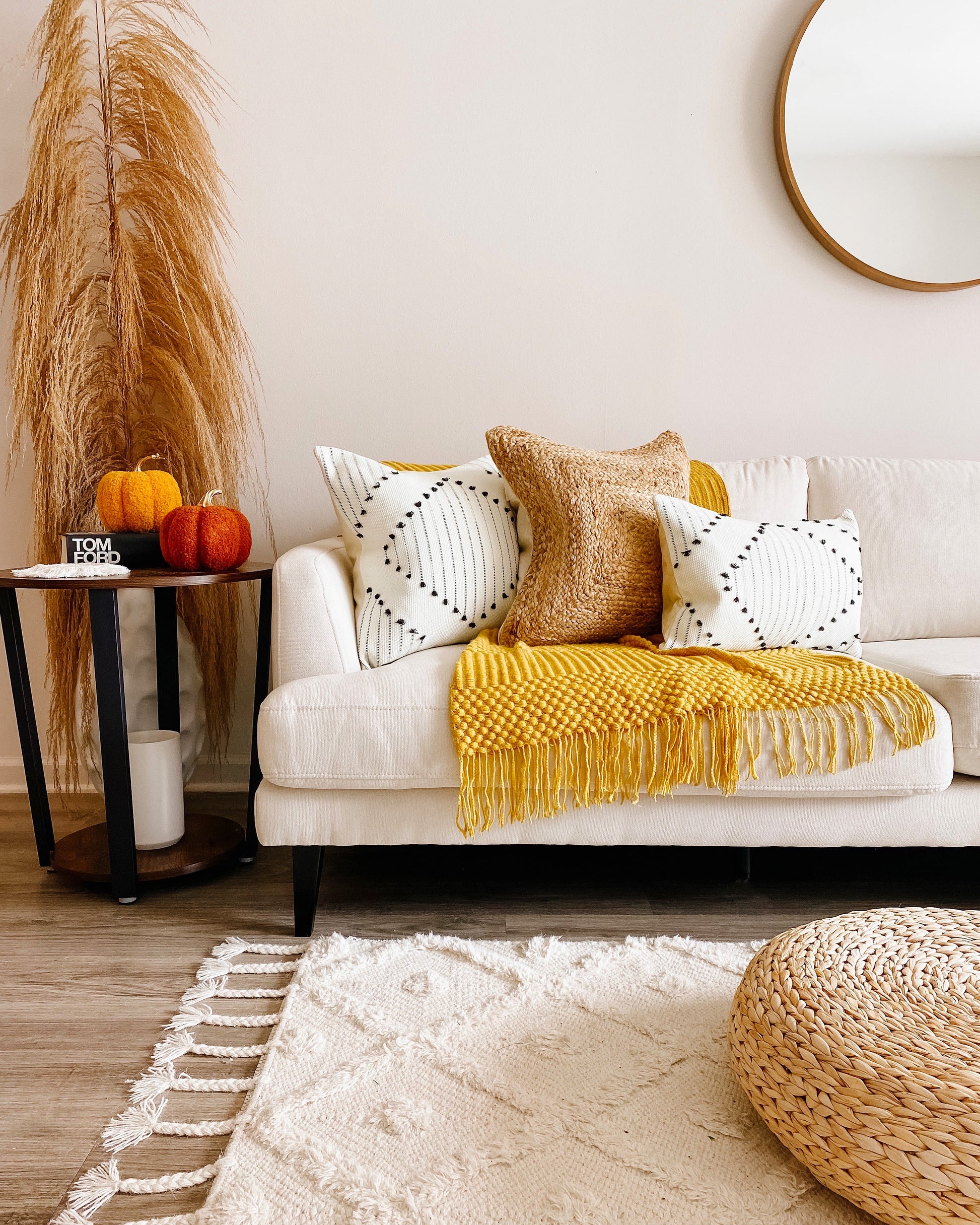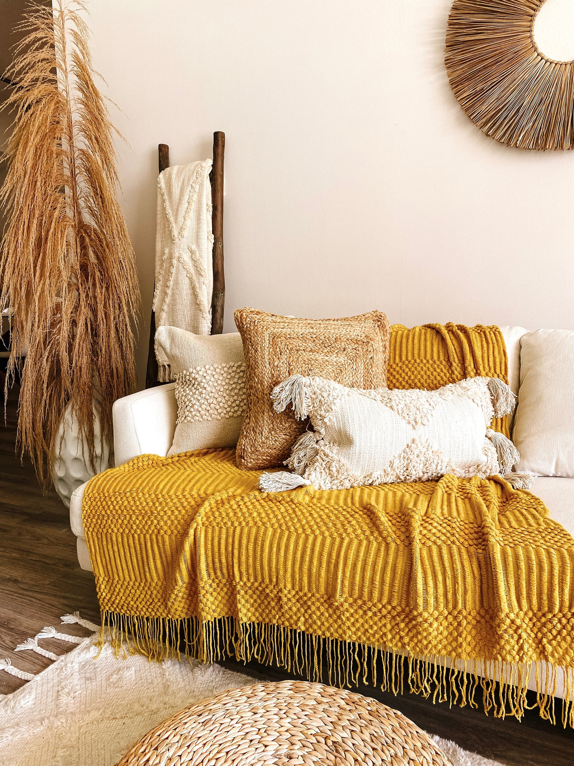 Wrap yourself in warmth and comfort with our exquisite mustard yellow throw blanket. Crafted to perfection, its soft texture and inviting hue create an atmosphere of cozy serenity. The delicate fringe adds a touch of rustic charm, making it the perfect addition to any living space. Whether draped over your couch or nestled on your favorite armchair, this throw blanket brings both style and comfort to your home.