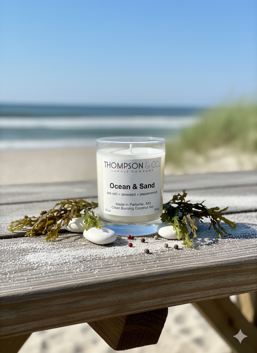 Transform your space into a beach-side retreat with Ocean & Sand, a hand poured candle infused with the fresh scents of sea salt, seaweed, and pepperwood. Let the soothing aroma of the ocean and sand transport you to a state of relaxation and bliss. (No beach required!)