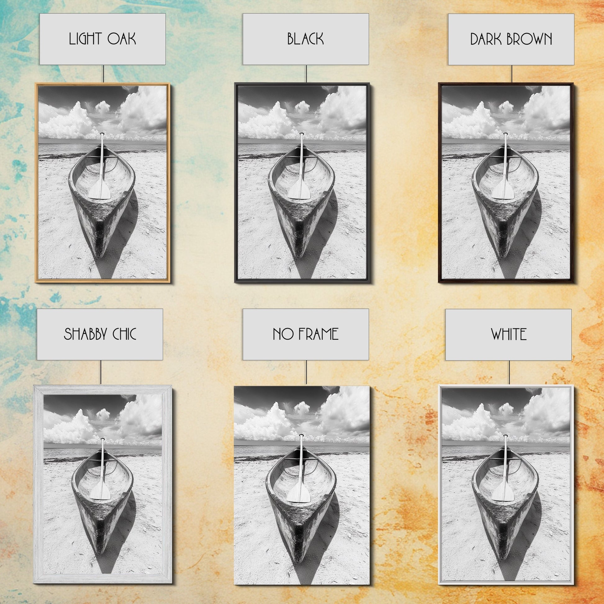 Paddle, Canoe, Beach, Clouds - Summer boating scene, Canvas Print, ideal bathroom or guestroom nautical art, rustic coastal boho wall decor