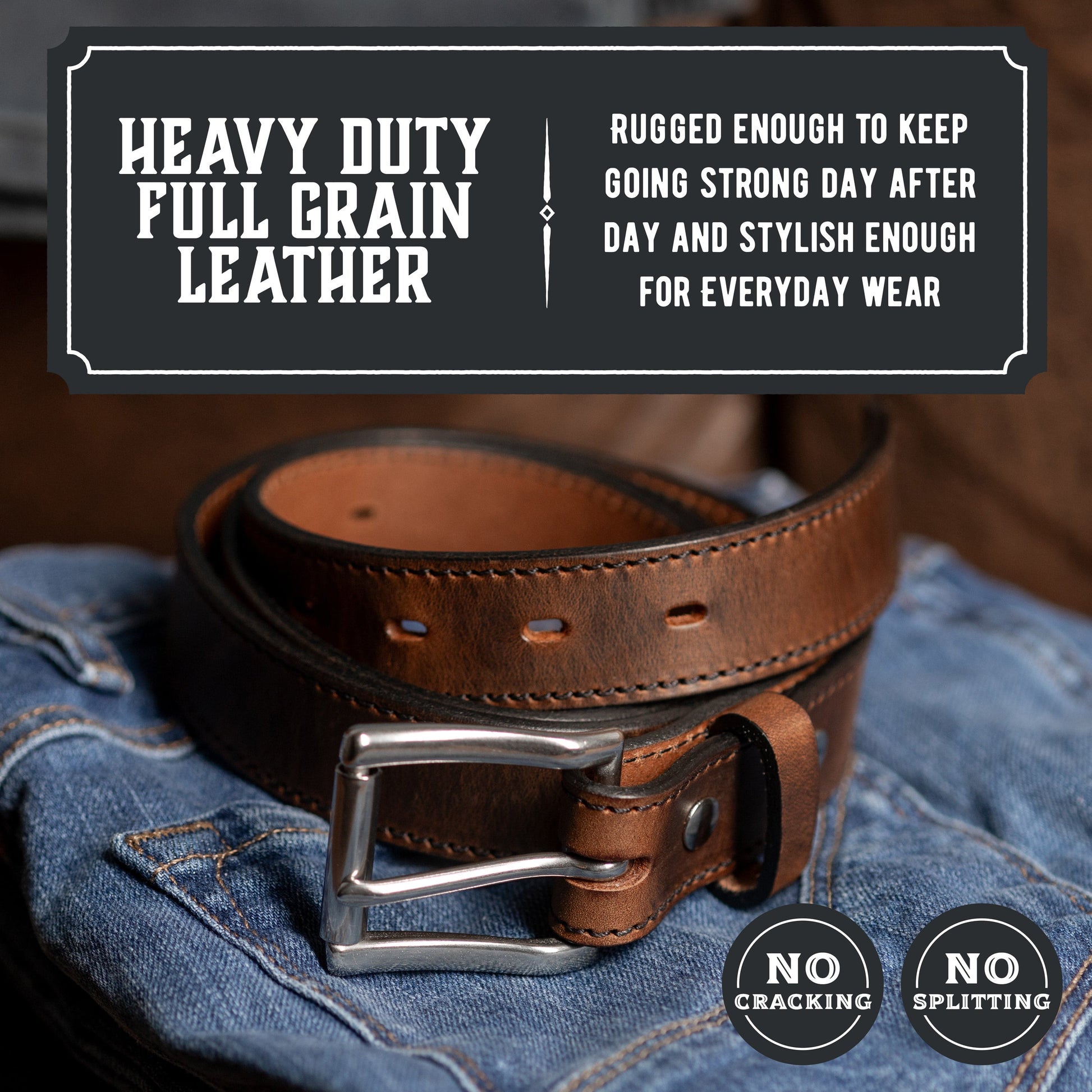 - You Asked for an 1 ¼” Men’s Leather Belt and We Listened! Say goodbye to your flimsy belt and hello to The Icon! Genuine full grain leather is the toughest, best leather there is which makes it perfect choice for a real mens leather belt. This 1.25 inch wide one piece belt will never split or break like most imported belts eventually do. The full grain leather will quickly break in to fit you specifically and is amazingly comfortable without losing its strength or durability.